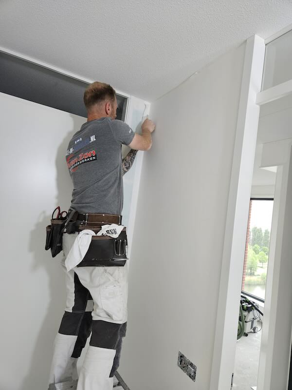 - Afkitten; wij kitten met een acrylaatkit rondom het renovlies alles af (ramen, kozijnen, langs het plafond).